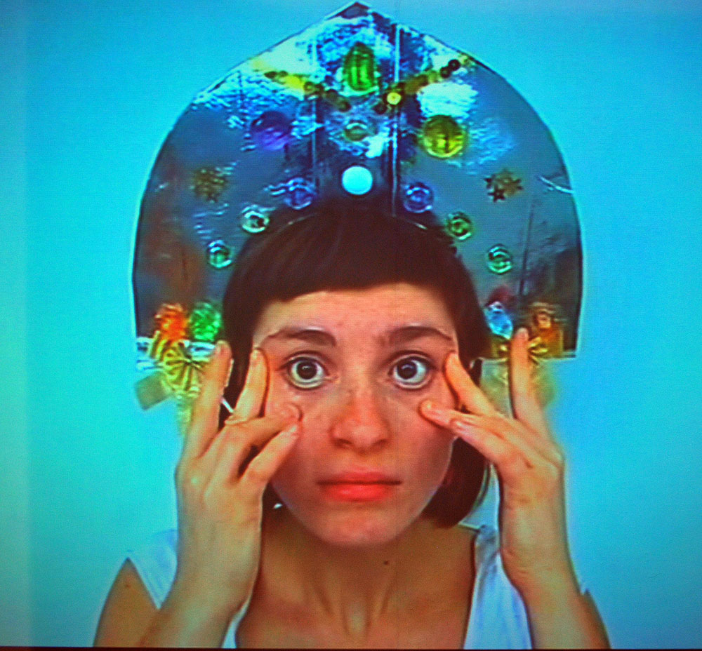 DSC_2331.jpg DSC_2334.jpg Ольга Ловцюс. Кривая и косая. 2009. Видеоинсталляция. Из какталога запомнилась еще одна мысль, которую извлекли кураторы при изучение старорусской архитектуры. Их восхитили два образца русской художественной формы – косая и загогулина. Видео с кривляющимися красавицами – одно из возможных продолжений. Кстати, барышня в кокошнике стала лицом этой выставки, любимое изображение для прессы.