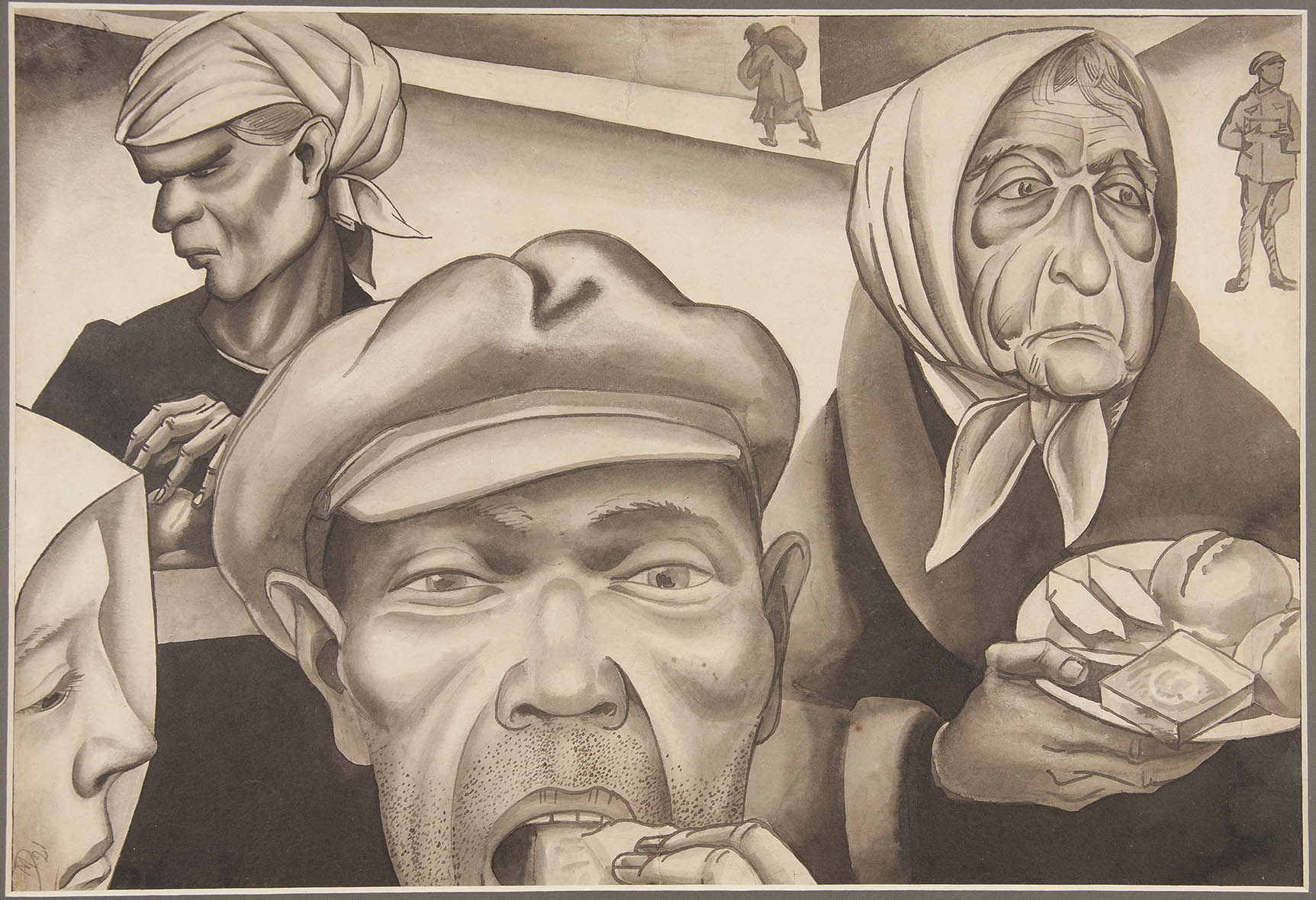 Неизвестный художник (инициалы МД) – 1921 - 32Х47 – бумага, белила, тушь – в левом нижнем углу инициалы «МД21». Приходит в голову Мечислав Доброковский и Дмитрий Моор, хотя прямых аналогов найти не удается.