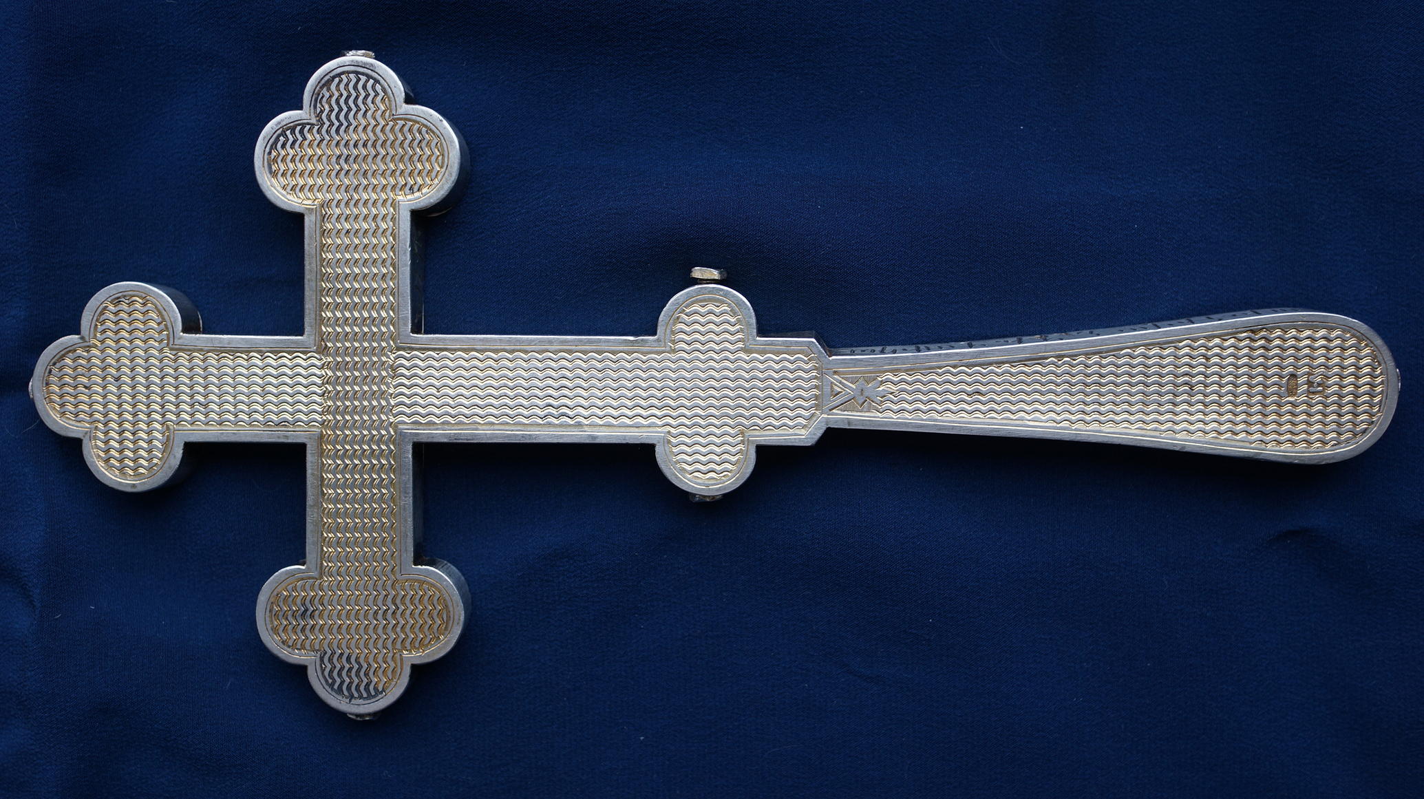 Материал: cеребро «84». Техническое исполнение: литье, гравировка штихельнем, позолочение, полировка, шлифовка, доводка, канфарение, монтировка. Размеры: Высота - 21см. Ширина – 10,5 см. Ширина – 0,9 см. Вес – ок. 100 граммов. Клейма: «84» пробы с "женской головкой в кокошнике, повернутой влево" вместе с альдерманом пробирера "ИЛ" (инициалы пробирного мастера, Лебедкин Иван Сергеевич (Москва, назначен в 1899 году)) в овале, именник мастера «I.A». С двух сторон выгравирована надпись на староармянском языке, говорящая о том, что «этот крест был создан в память о священнике Вартане из Нахичивани». Отец Вартан вероятно был в конце XIX века священником Ново-Нахичеванской и Бессарабской епархии Святой Армянской Апостольской православной Церкви. В отличном коллекционном состоянии. Без реставрации и утрат. Цена договорная. Детали и доп.фото через эл.почту: arz-wien@rambler.ru |