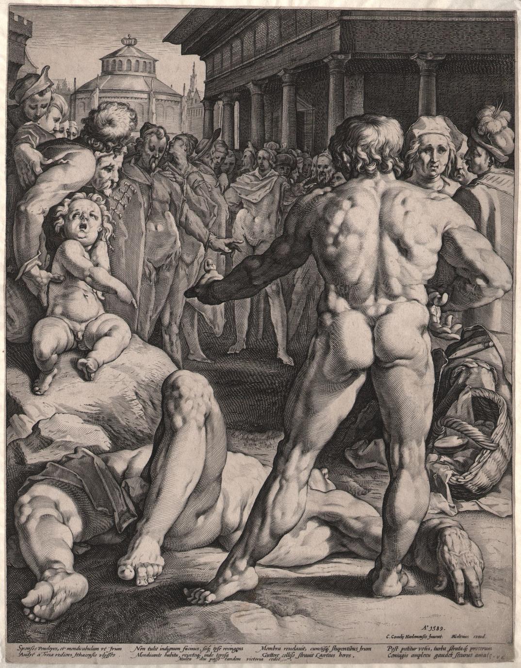 1589. Гравировка Печать от: Ян Харменс, Мюллер После: Корнелис Корнелис. ван Харлем Опубликовано: Хендрик Гольциус водяной знак ПЕРВОЕ СОСТОЯНИЕ! Размер изображения 42,80 x 33 см ссылки: New Holstein (Dutch and Flemish) 30.I (The Muller Dynasty (Jan Harmensz Muller)) Bartsch III.276.30 Ян Харменс. Мюллер (1571 - 1628) Великолепнейший художник - маньерист, который родился и работал в Амстердаме. Последняя продажа этой гравюры (буквально 3 дня назад на Bassenge) более поздняя печать - 4600Евро