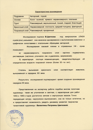At work there are experts zaklyuchenie.Podpis plotted simultaneously with the execution of work and graphically comparable to the author's samples, but that it smuschaet.U I can not compare this work with other works Tsvetkova this period.