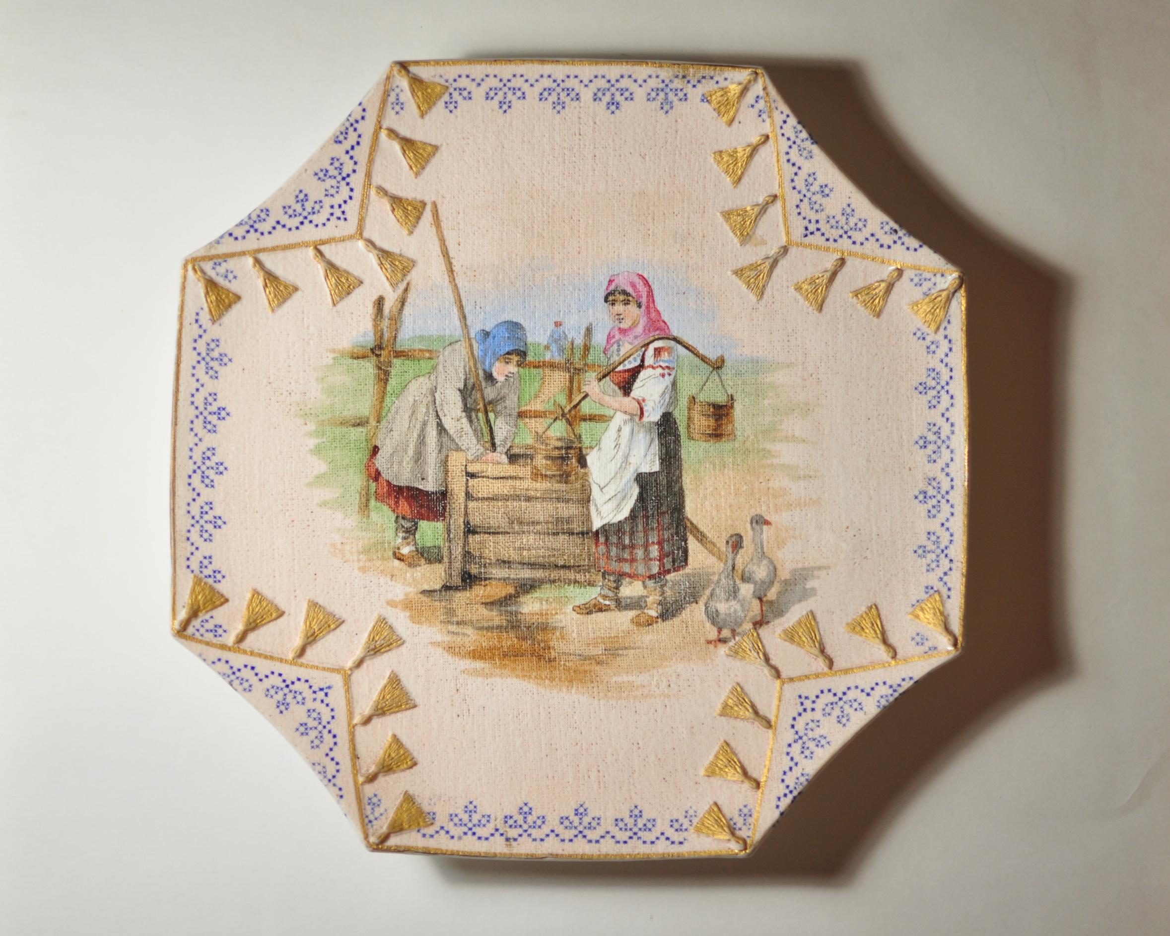 Прошу помочь с атрибуцией тарелочки Живопись На обратной стороне клейма не нашёл. Но на передней стороне внизу колодца стоит подпись. Правда, не могу разобрать. Размер 26х26 см Спасибо за помощь! С уважением, VIA |