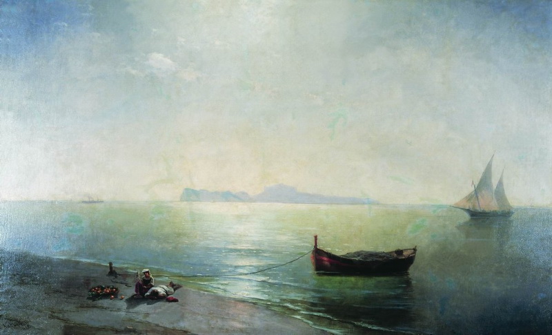 Невозможно определить автора слабой копии с работы Айвазовского "Штиль. Вид Капри. Средиземное море". Оригинал находится в Ереване.