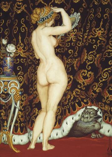 Наверное, апофеозом славы Калмакова стал в 1908 году личный запрет «за непристойность» Николаем II в театре Веры Комиссаржевской спектакля «Саломея» по пьесе Оскара Уайлда в постановке Николая Евреинова. Великий режиссер и ниспровергатель, к слову, очень ценил талант художника. Некоторые искусствоведы даже называли Калмакова «Русским Бердслеем». Действительно, у легендарного англичанина и таинственного мастера из России было много общего. Более чем откровенные любовные видения, игра с мифами и потрясающая фантазия объединяли обоих мастеров. Сам Калмаков беспрерывно устраивал из своей жизни феерию. Ведь у мастера, запросто беседовавшего с демонами, все должно было быть не совсем так, как у обычных людей. Одевался он, к примеру, так словно ему надо было выходить на сцену. Как и его друг Николай Евреинов, появлялся в изысканных и необычных нарядах. Стильные маленькие усы и эспаньолка делали его похожим то ли на миниатюру с изображением Петра I, то ли на героев картин Веласкеса. Пальто всегда было сшито по собственному фасону, обязательным атрибутом костюма также были гетры. И еще его все время окружали слухи и легенды. Которые он, естественно, обожал создавать сам. Может быть, не давал покоя ему бурная кровь – мать его была итальянка и пела в опере, отец, исправник и статский советник, покинул свою темпераментную жену вскоре после рождения сына. Сам художник, правда, намекал, что отец был армейским генералом, но дальнейшие изыскания подтвердили, что Константин Николаевич Калмаков лишь служил в Петергофском уездном полицейском управлении. Говорили, что огромное влияние оказала на будущего мастера гувернантка – немка, погружавшая своего воспитанника в мир сказок Гофмана и братьев Гримм. Не здесь ли следует искать корни мрачных фантазий Калмакова, ставшего своего рода знаменем русского символизма. Все у него было не так. К примеру, он никогда не покупал красок, но приготавливал их сам из трав и растений. Жил уединенно в домике у большого Петергофского парка, где были очень высокие узкие окна. Гостям и знакомым рассказывал, что беседовал с чертом, только никак не мог зарисовать. То удастся набросать копыта, то хвост. И показывал эскизы, и посетителям становилось жутко, словно действительно их накрывала волна какого – то неземного холода. В 1920 художник покинул Россию и эмигрировал во Францию (по одной версии, через Константинополь, по другой — через Латвию или Эстонию); с 1924 обосновался в Париже, где в 1926–1947 жил на улице Ларошфуко. В эмиграции Калмаков вел замкнутый образ жизни, избегая общения с кругами бывших соотечественников. Если в первые годы эмиграции он устраивал выставки своих работ, которые не вызвали большого интереса, то в конце жизни мастер фактически был предан забвению. Единственным его другом был художник С. П. Иванов. Умер Калмаков в 1955 в старческом доме города Шелль. В 1964–1970-х коллекционеры Жорж-Мартин дю Нор и Бертран Коллэн дю Бокаж, обнаружившие на «блошином» рынке 40 картин художника, организовали серию его персональных выставок в Париже и Лондоне, заново открыв творчество мастера публике. (Виктор Леонидов .Ангел бездны. Первая книга о «Русском Бердслее».) |