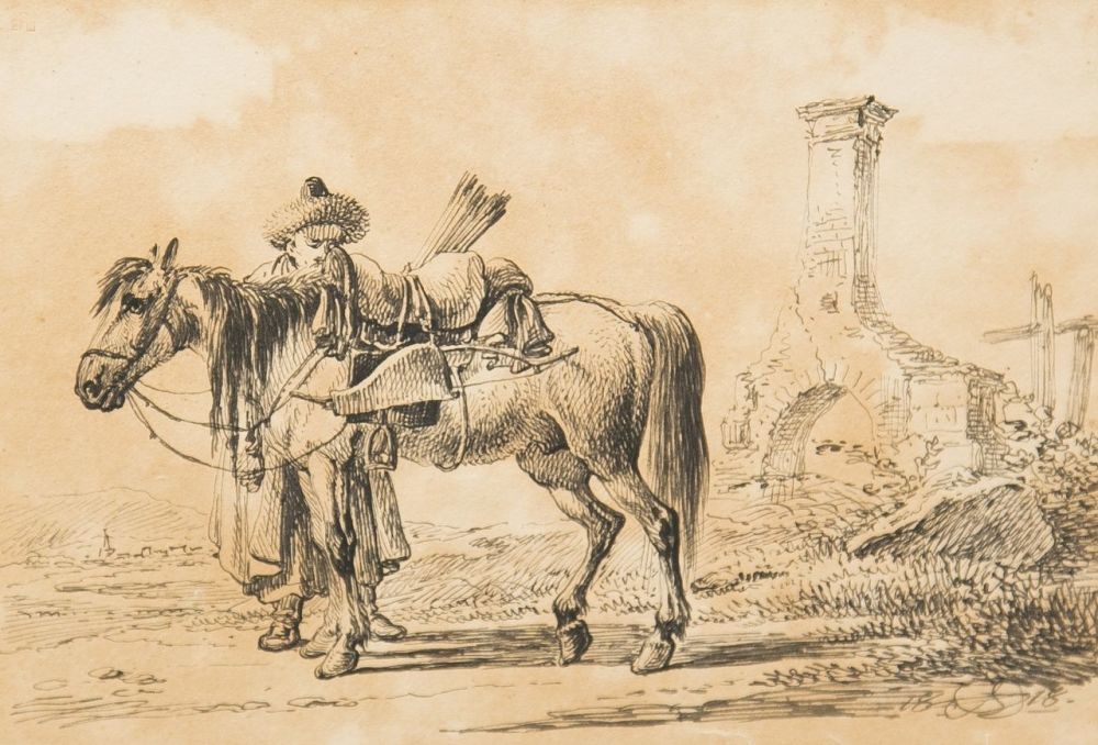 Художник Орловский Александр Осипович «Башкирский воин, садящийся на коня» 1818 год.