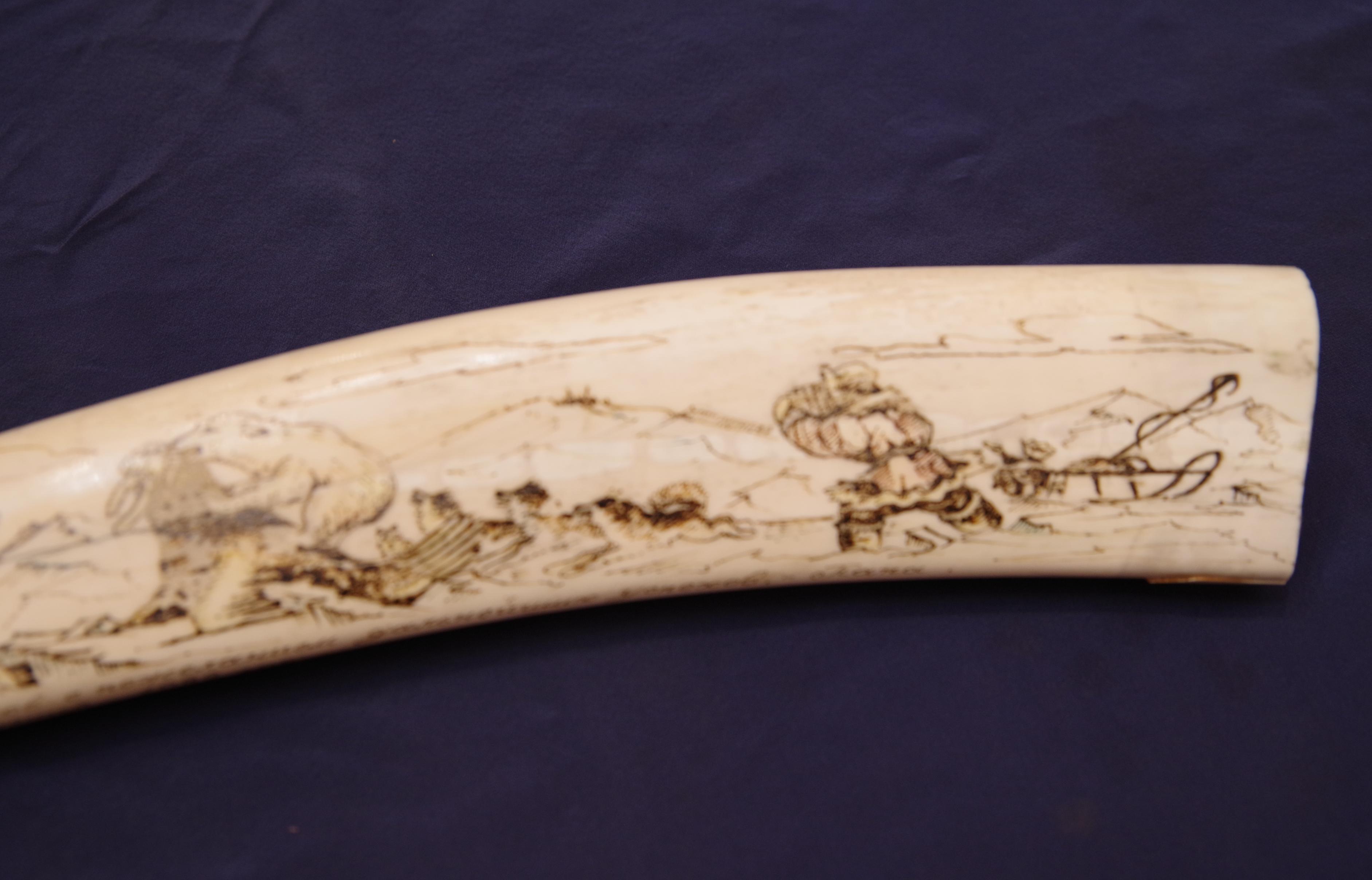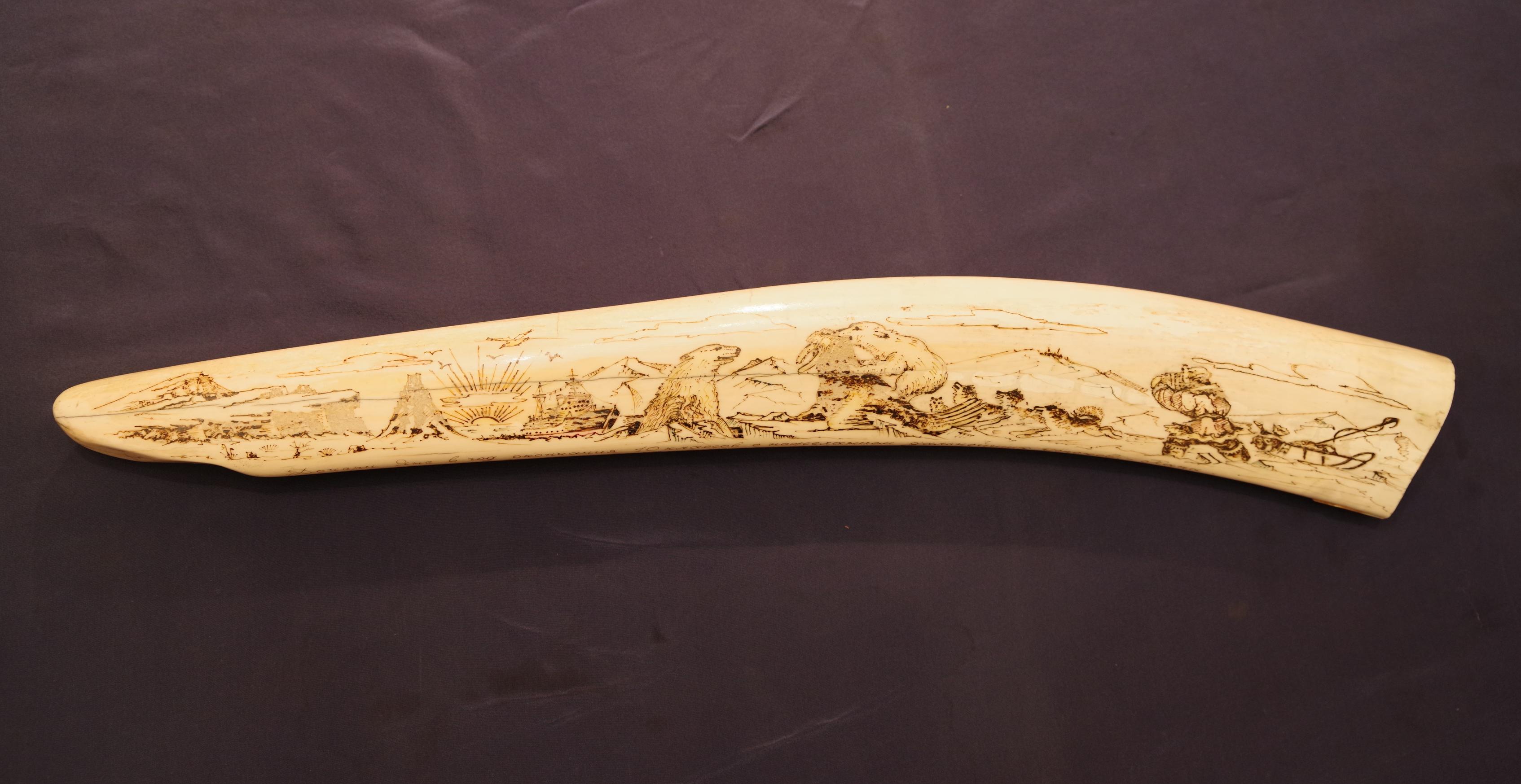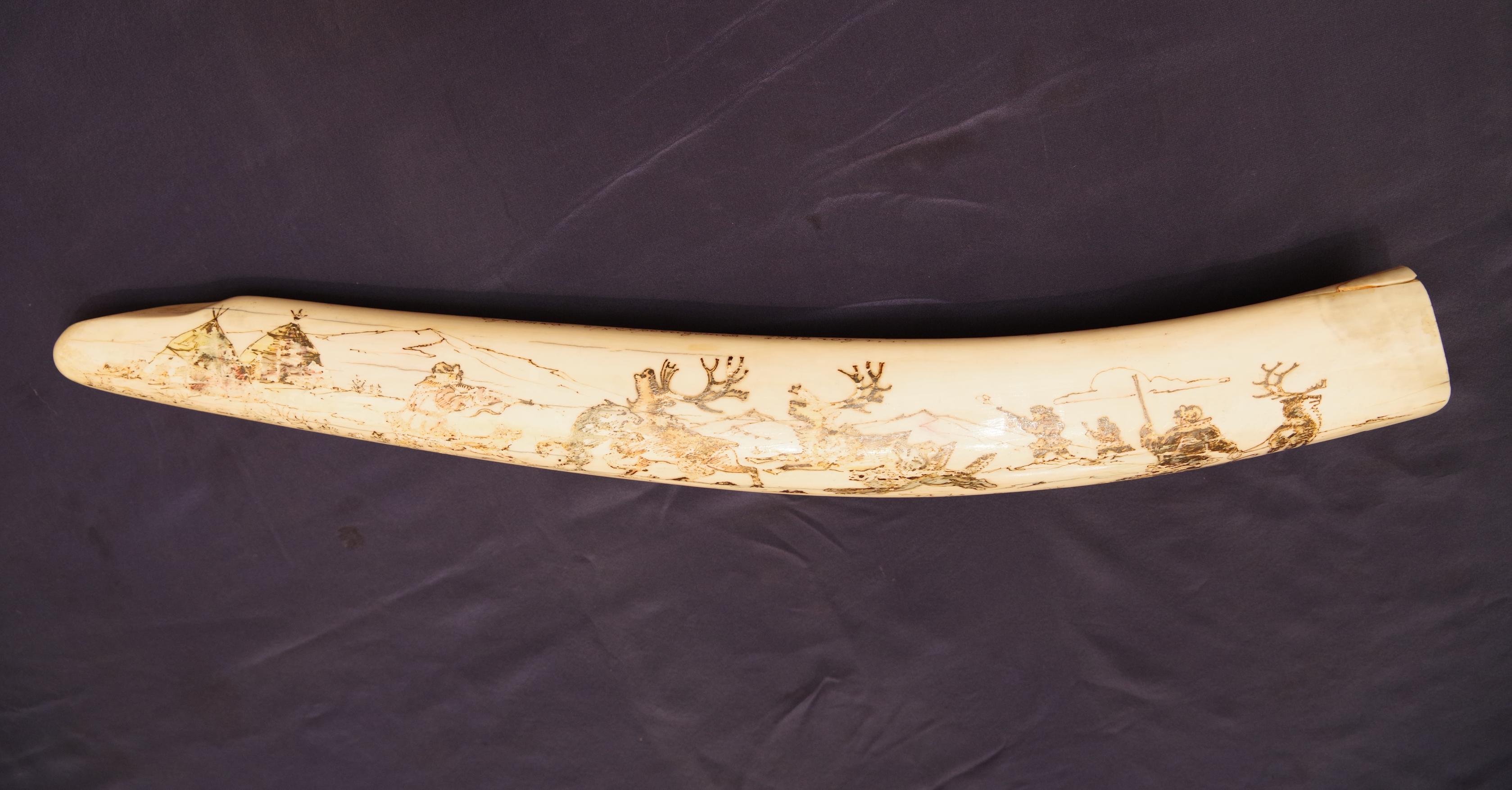 Винтажный чукотский сувенир - клык моржа, расписанный чукотским народным художником сценами северного быта. СССР, Чукотка, б/х Провидения, 1982 г.