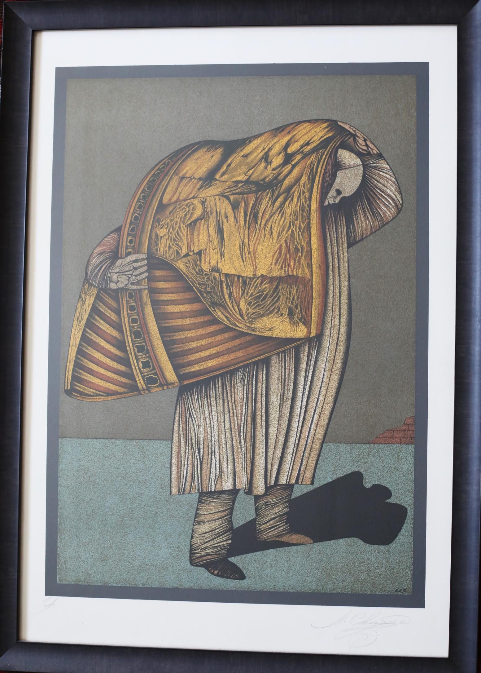 Работа № 10 из портфолио «Чрево Парижа», 1977 г. Издатель Fernand Mourlot, Париж, Франция. Бумага, литография, 54 х 76 см. Работа подписана и пронумерована автором. Оформлена в раму со стеклом. Цикл является своеобразной иллюстрацией к роману Э. Золя «Чрево Парижа» и посвящен жизни известного парижского мясного рынка Ле Аль/Les Halle, и его обитателей. «Чрево Парижа» - единственный завершенный цикл Михаила Шемякина. Работы из этого цикла вдохновили В. Высоцкого на написание песни «Тушеноши» (1977 г.): И кто вы суть? Безликие кликуши? Куда грядете - в Мекку ли в Мессины? Модели ли влачите к Монпарнасу? Кровавы ваши спины, словно туши, А туши - как ободранные спины И ребра в ребра и нету спасу. |