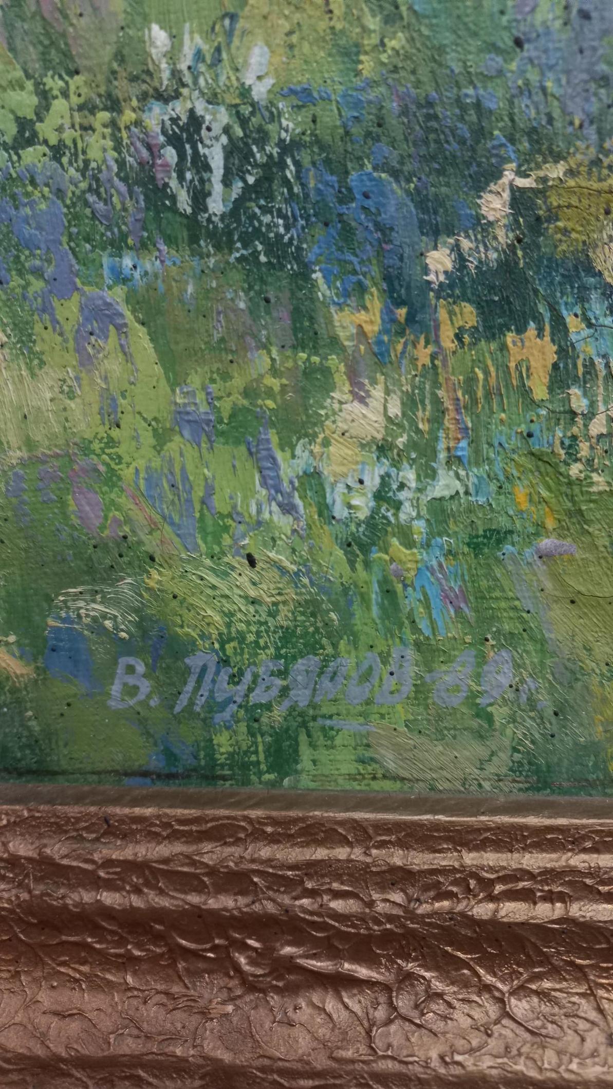 Уважаемые форумчане! Сегодня попалась вот такая картина: 80на100 см х/м "Летний день" 1989г. художник Лубянов Вячеслав Иванович. Хранили в безобразном, на мой взгляд состоянии. Имеется один скол, а также при попытке "позолотить" раму, не вынимая холста, "позолотили" и холст. Кроме того какая-то не понятная линия сероголубая не далеко от подписи. В остальном картина в хорошем состоянии. На фото всё отразил. Вопрос в следующем, возможно ли её продать в таком состоянии или замарочиться и превести в порядок? И второй вопрос сколько может стоить, как есть?