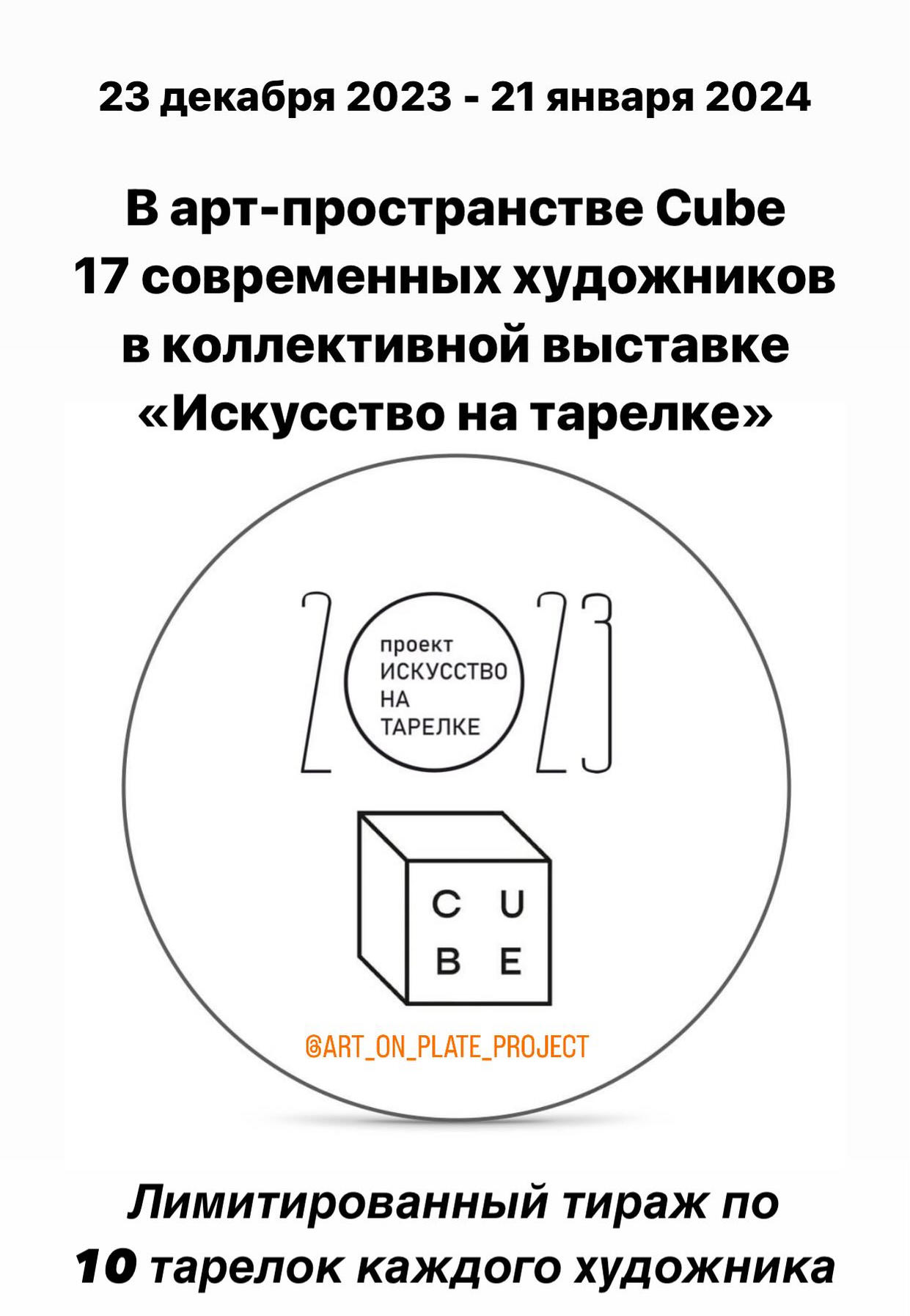 В период с 23 декабря 2023 по 21 января 2024 в арт-пространстве Cube пройдёт коллективная выставка «Искусство на тарелке», в рамках которой принимают участие 17 современных художников. В рамках проекта была создана коллекция тарелок с произведениями художников ограниченного тиража. Цель проекта — объединить современное искусство и повседневную жизнь, а также показать зрителям, что искусство можно не только коллекционировать, но и сделать его частью своей бытовой реальности. Каждая коллекционная тарелка представлена лимитированным тиражом в 10 экземпляров. Ознакомиться с полным каталогом, cделать предзаказ и приобрести тарелки художников можно по ссылке |