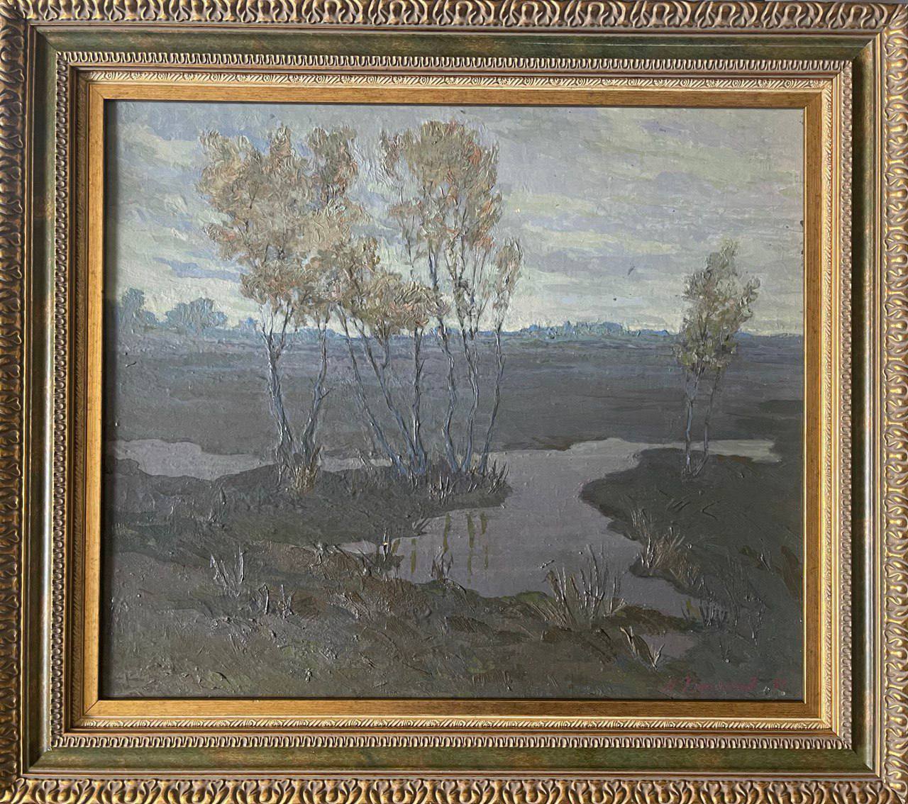 Холодный вечер 1987 год Картон / масло 38 / 43,5 Советский и российский художник. Живописец. Работает в жанрах пейзажа и натюрморта. В 1981 году окончил Московский государственный художественный институт им. В.И. Сурикова. Член МСХ с 1994 года. Работает в жанрах пейзажа и натюрморта.