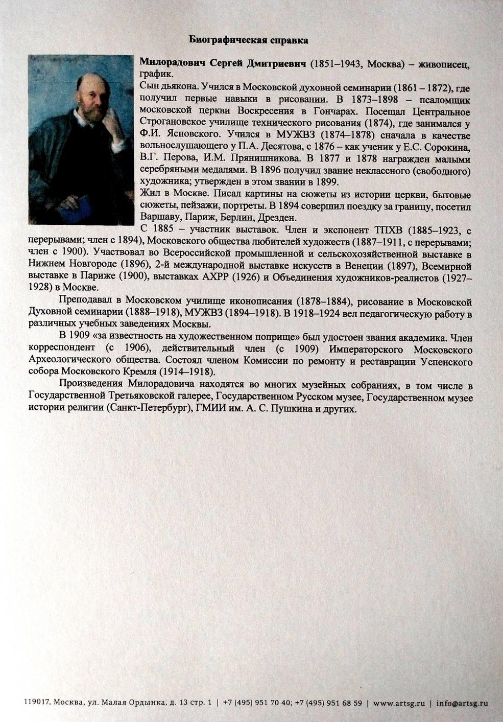 Холст на картоне, масло. 39,3 Х 29,4. 1900-е гг. Подпись справа вверху: "С. Милорадовичъ" Сергей Дмитриевич Милорадович (4 (16) июля 1851, село Тёсово, Можайский уезд, Московская губерния — 4 февраля 1943, Москва) Русский исторический и жанровый живописец, педагог, академик Императорской Академии художеств, член Товарищества передвижных художественных выставок. Учился в МУЖВЗ (1874 - 1878), с 1876 - ученик у С.Е. Сорокина, В.Г. Перова, И.М. Прянишникова В 1885–1923 годах выставлялся на передвижных выставках. Писал сцены из истории духовенства, монашества и раскола. Известнейшие из них: "Чёрный собор 1666 года" (в Третьяковской галерее), "Суд над патриархом Никоном" (1906, ГИХМ "Новый Иерусалим"), "Оборона Троице-Сергиевой Лавры", "Патриарх Гермоген", "Протопоп Аввакум в братском остроге", "Аввакум, идущий в Сибирь", "Накануне Пасхи" и др. В 1909 "за известность на художественном поприще" был удостоен звания академика. Член корреспондент (с 1906), действительный член (с 1909) Императорского Московского Археологического общества. Состоял членом комиссии по ремонту и реставрации Успенского собора Московского Кремля (1914-1918) Произведения Милорадовича находятся во многих музейных собраниях, в том числе в Государственной Третьяковской галерее, Государственном Русском музее, Государственном музее истории религии (Санкт-Петербург), ГМИИ им. А.С. Пушкина и других .................................................. .................................................. ........ Представленное произведение входит в число подготовительных этюдов к "Суду над патриархом Никоном", выставлявшегося на XXXV Передвижной художественной выставке. Вероятнее всего на портрете изображён восточный Патриарх Макарий Антиохийский, один из председателей церковного суда над патриархом Никоном, проходившего в 1666 году в Благовещенской церкви Чудова монастыря. Черты изображённого на портрете архиерея схожи с изображением Патриарха Макария Антиохийского из Царского Титулярника 1672 г. .................................................. .................................................. ........ Имеется экспертное заключение Центра художественной экспертизы им. И.Е. Репина (см. фото) Цена договорная - обсуждение в личных сообщениях или по мейлу: arttalk@inbox.ru |