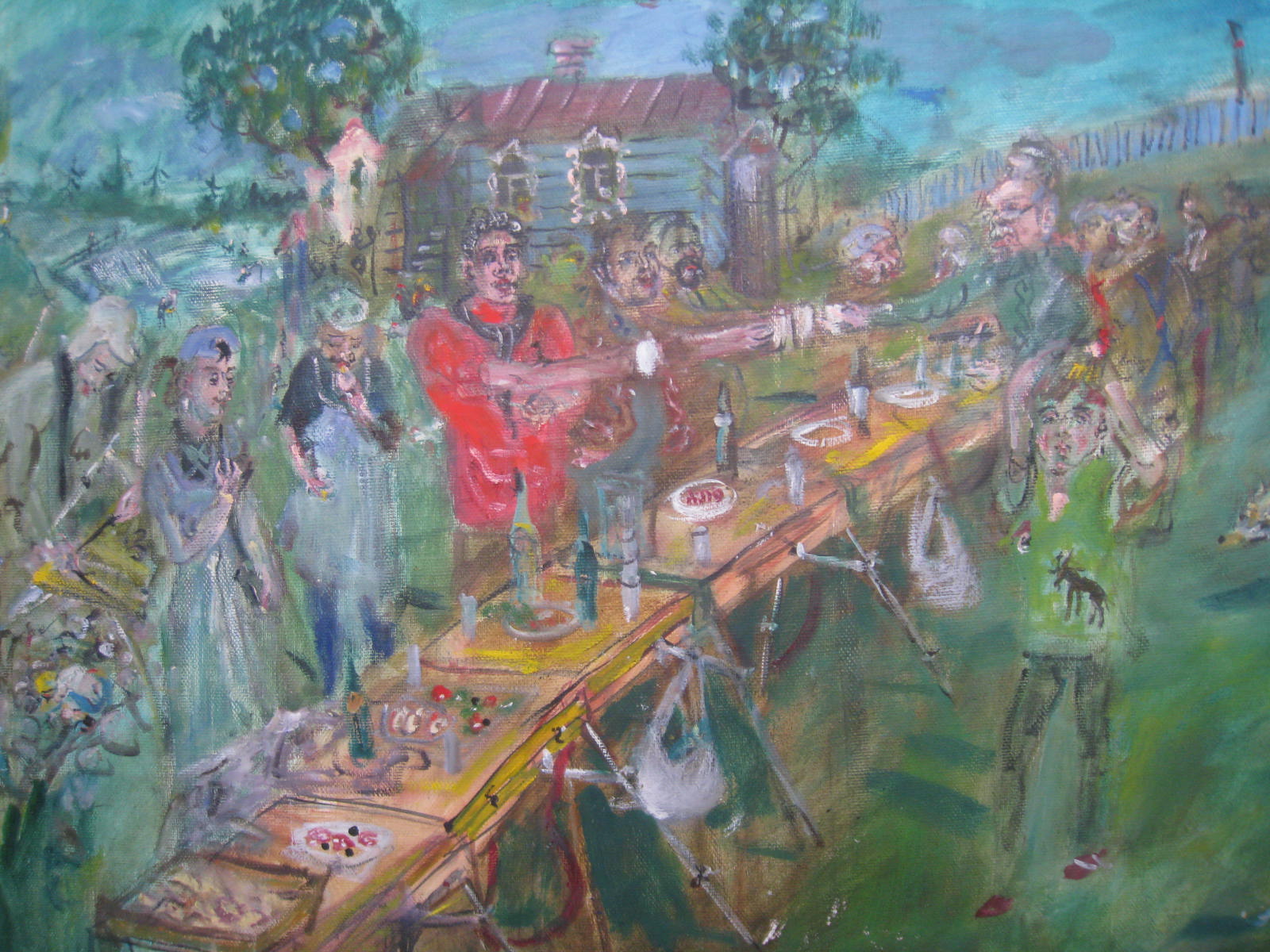 not attempt to invent a precise stylistic name what she was doing. It soon came to the literary term "stream of consciousness", which was renamed for the arts in the flow of paint "or" stream writings. This realism and surrealism, expressionism and primitive together. This, as the Germans would say, stylistic «mischung». But at the same time it is very recognizable individual, that is konyshevskaya style images. It's really evolved over the years, its free technique of rapid writing, and beginning a portrait, or even multi-figured compositions in the morning, finished it for dinner, or (depending on the size of the canvas) to the evening meal. But the ending, it can suddenly something spontaneously recall and quickly finish desired, in its view, detail, sometimes significantly altering the original idea. The peak of creativity Konysheva fell on a difficult and troubled time, 70-90-ies, when Russia's artistic life is lukewarm in the Brezhnev years of stagnation, then, conversely, was in full swing during the so-called "perestroika". Conspiratorial apartment exhibitions, legal bursts on "Little Georgia, 28, Arbat and metropole libertines in the open air, and, finally, our times, when it was time the most important test - the test of freedom. Konysheva for all these decades remained by itself, since its inner freedom can not be defeated by any external factors. |