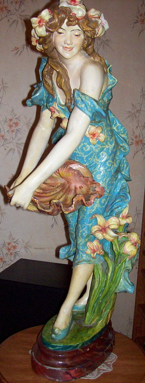 The inscription on the pedestal - Fine, but that below - not visible. Perhaps the author? Or shop? At the time, if on the style - the 1910 year. But paint some very today, somehow not lived figurine. By price I do not know - not gratifying to advise you, especially now. |
