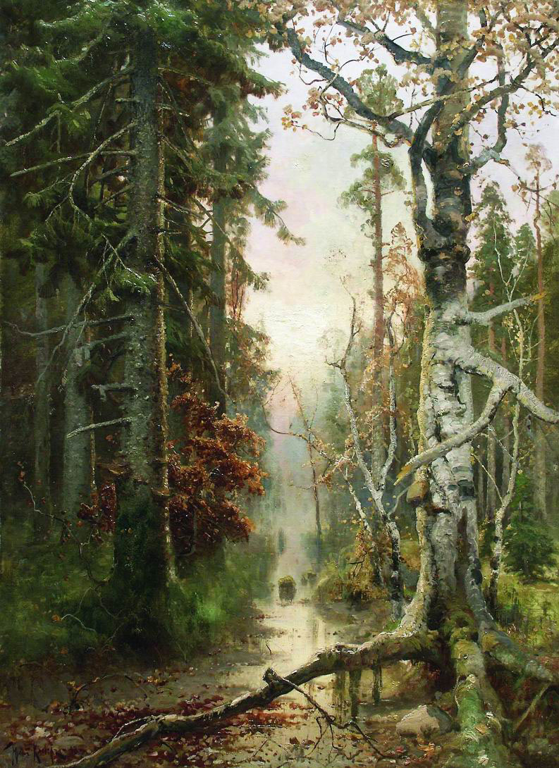 Обучение искусству пейзажа в Академии художеств при ее становлении сводилось к освоению единственно возможной, как было принято думать в те времена, итальянской школы пейзажной живописи. А отсюда возникший термин «итальянский (а значит, академический. — авт.) пейзаж» означал красивое изображение (форма) красивой местности (содержание). Постепенный естественный (или эволюционный) отход от академического пейзажа наблюдается в русской живописи фактически с середины XIX века. И хотя чистота направлений в пейзажной (и не только в ней) живописи — понятие достаточно условное, гипотетически выделим пейзажную живопись академическую по форме (красивость в исполнении) и неброскую по содержанию (скажем, незатейливый кусочек натуры). К примерно такому направлению и принадлежат пейзажи Юлия Юльевича Клевера, уроженца города Дерпта (ныне — Тарту, Эстония), учившегося в Академии художеств (1867—1870) у С.М. Воробьева и М.К. Клодта. Его работы пользовались огромным успехом у современников: Деревня на острове Нарген (1881), Заброшенная мельница (1890), Рыбацкая деревня (1892), наконец, Забытое кладбище (1890). Наверное, его картины многих волновали и волнуют. Но, что не вызывает сомнения, они радуют глаз, пробуждают чувство, близкое к умилению, дают понимание, что написаны талантливым живописцем. Последнее объективно, поскольку картины Ю.Ю. Клевера до сих пор пользуются большим спросом на антикварном рынке. Естественно, что Ю.Ю. Клевер достиг и формального признания: он академик живописи, профессор Академии художеств, член-учредитель Общества выставок художественных произведений.