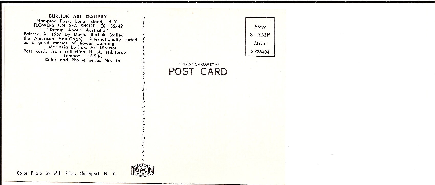 3-2a. 50 years with Mayakovsky. 88mm x 140mm 3-2c. Other Side 3-5a. David Burliuk. Offer. 228mm x 154mm 3-5c. Other Side 3-7a. Vaclav Fiala. Portrait of Burliuk. 110mm x 145mm 3-7c. Other Side 3-19a. David Burliuk. Flowers on the beach. 88mm x 143mm 3-19c. Other Side |