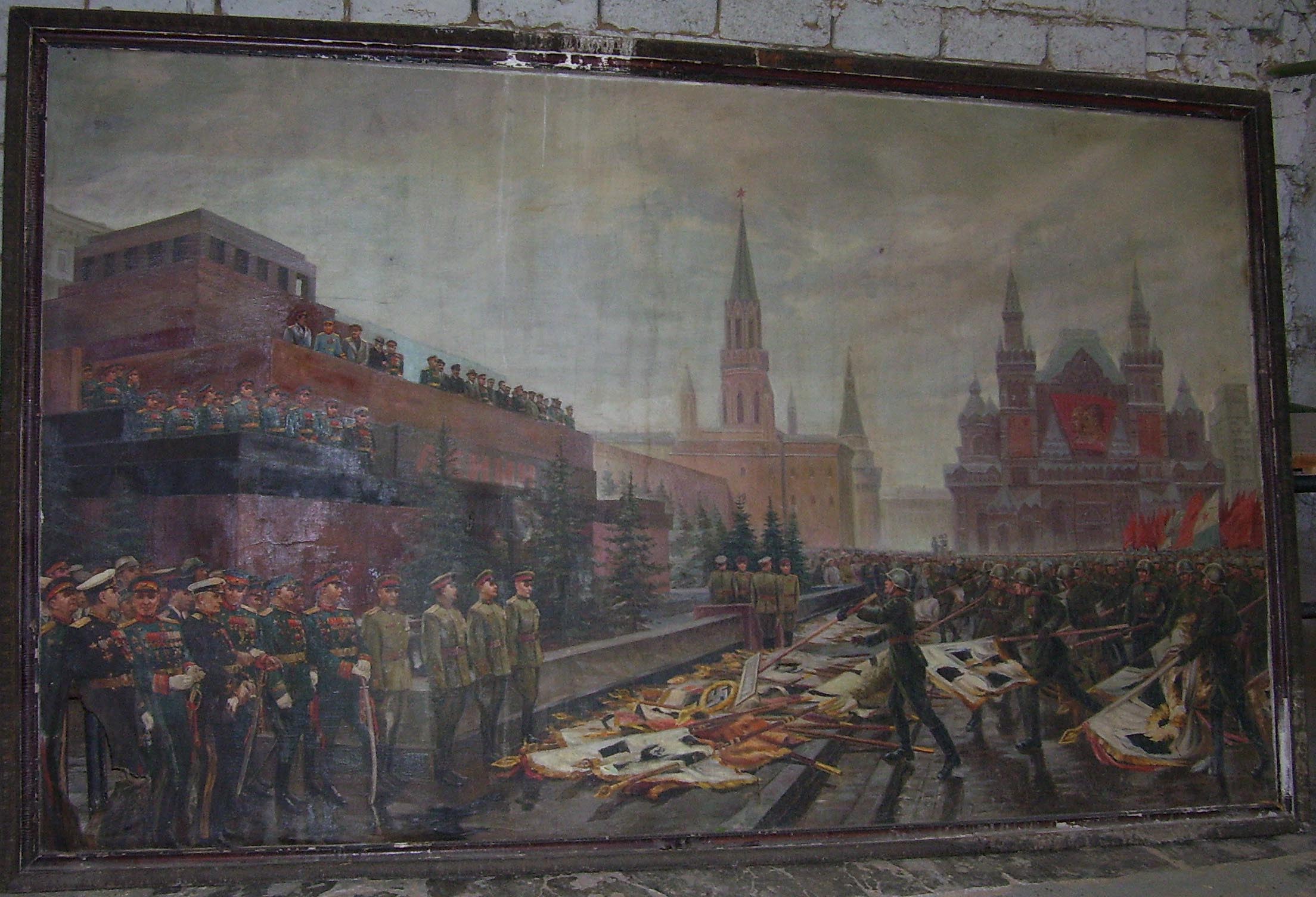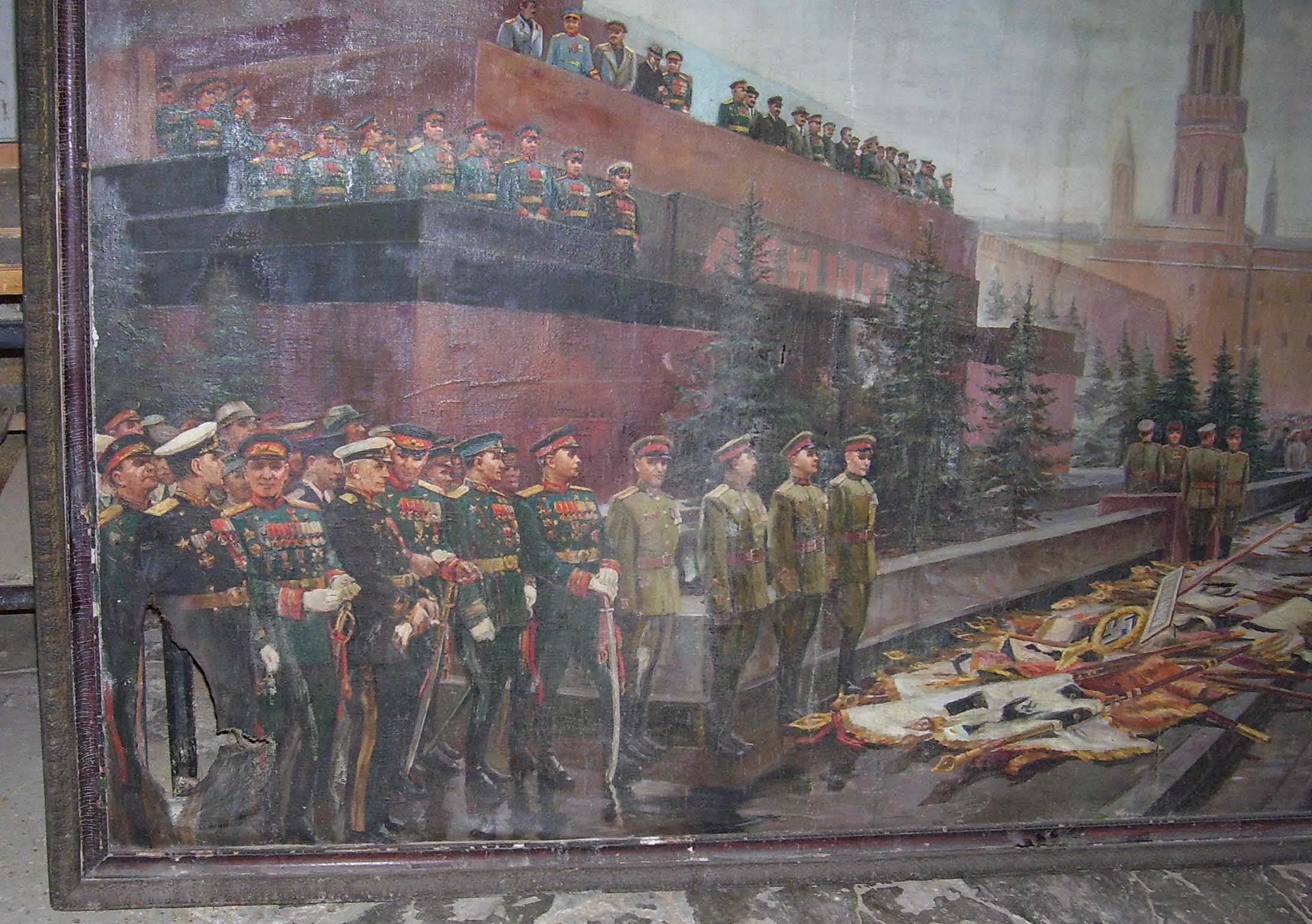 Продам картину в стиле соцреализма на военную тему. "Парад Победы". Автор неизвестен. Масло, холст. Размер 300х150 см. Картина имеет повреждение.