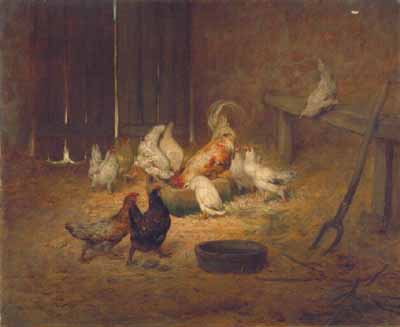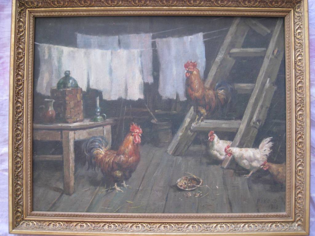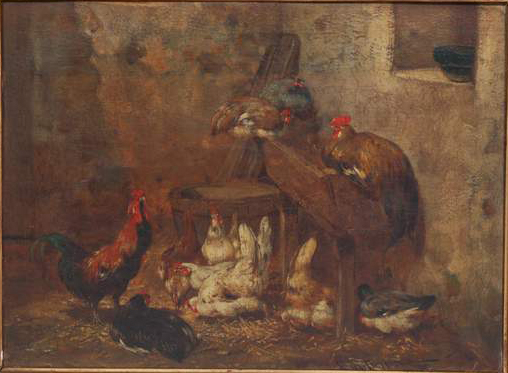 Но картина у Вас симпатичная. В стиле барбизонцев-анималистов: Шарля Эмиля Жака (Charles Emile Jacque, 1813 - 1894) или Филибера-Леона Кутюрье (Philibert-Leon Couturier, 1823 - 1901). Если бы не подпись и не дата, то я подумал бы, что это - работа Кутюрье. Никто другой так не любил изображать кур и петухов, да и подобный интерьер типичен для него. Скорее всего, у Вас - копия одной из работ этих художников. |