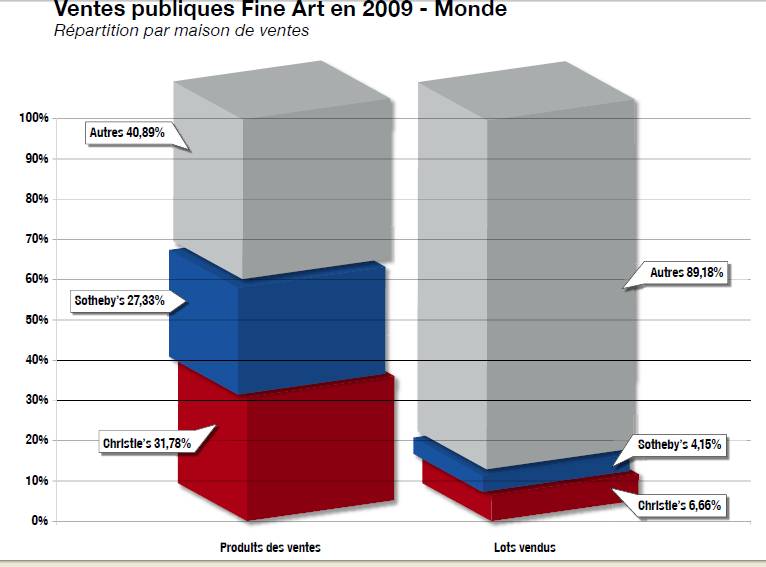 Эти потери в выручке англосаксонского рынка, тем не менее представляющего собой 49% мирового оборота публичных продаж, объясняется плохими результатами двух мастодонтов - Christie’s и Sotheby’s. Количество лотов, проданное на их торгах, по отношению к 2007 г. сократилось соответственно на 34% и 47%. Это сокращение объемов прямо отражается на годовом обороте: оборот Christie’s понизился по сравнению с 2007 г. на 57%, а оборот Sotheby’s – на 60%. Взятые вместе эти аукционные дома представляют 60% мирового оборота публичных продаж, но только 10% сделок. Их позиция стала менее устойчивой по сравнению с 2008 г., когда они представляли 72,3% мирового оборота и 15% сделок.
