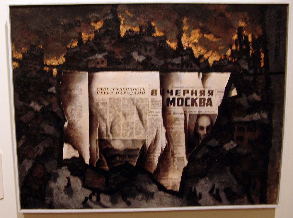 Гриша Брускин. Фундаментальный лексикон. 1986. Алексей Сундуков (Майский). Продолжительная и несмолкаемая овация. 1987. Холст, масло. Борис Орлов. Генералы россйиской науки и культуры (справа). 1982. Коллаж на бумаге. Илья Репин, А.С. Пушкин, Михайло Ломоносов, Максим Горький, Иван Павлов, Владимир Маяковский. Гриша Брускин. Гриша Брускин. Рождение героя. 1985. Скульптуры, см.т. Александр Косолапов. Дверной звонок. 1972. Крашенное дерево. Константин Звездочетов. Мальчиш-Кибальчиш в Африке. 1984. Ткань, масло. Леонид Соков. Головоломка. 1977. Металл, механизм и алгоритм разгадки. |