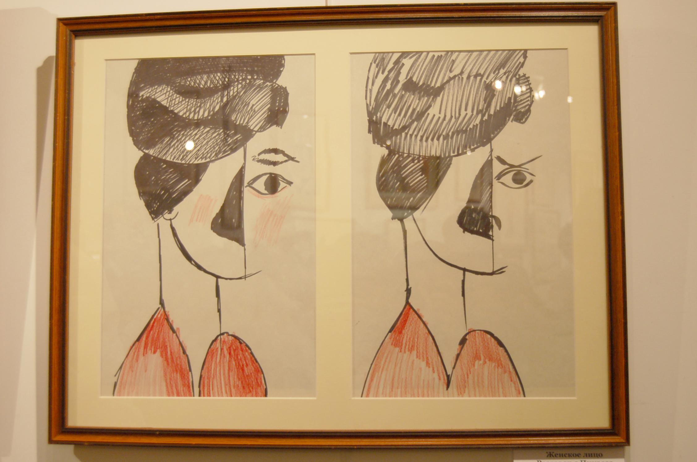 2 - Голгофский крест на куполе нач1970х Бумага/ масляная пастель 3,4 - Женское лицо. Разговор с Пикассо конец 1950х Бумага/ фломастер, масляная пастель 5 - Оранжевый дом 1950х Бумага/гуашь 6 - Глаз 2, 1962 Бумага/акварель 7 - Автопортрет 1940-е Бумага/тушь Автопортрет 1944-45 Бумага/тушь, графитный карандаш