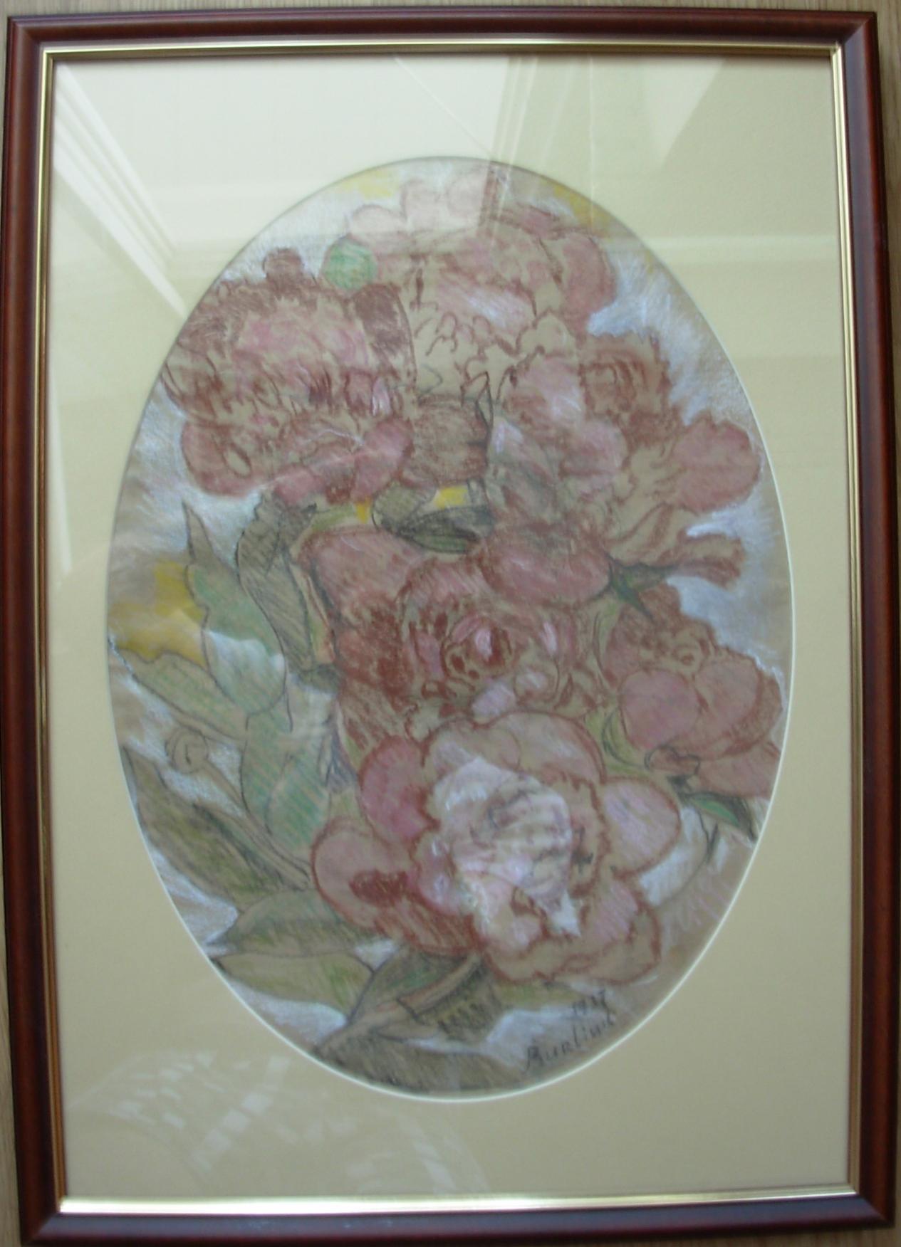 John Preston, По всейвидимости имеется ввиду с Гелос Бурлюк Давид Давидович (1882-1967). "Пионы". 1937 г. Бумага (калька), черный карандаш, восковые карандаши, мел. 29,5х40,2 (овал). Справа внизу подпись и дата: "Burliuk 1937". На обороте "Маруся Бурлюк". 1920-е гг. Бумага (калька), графитный карандаш, сангина, мел. На рисунке изображена Мария Никифоровна Бурлюк (в девичестве Еланская), жена художника с 1912 г., его помощница в литературной и издательской работе. Экспертиза ГТГ. Эксперт Жукова Е.М. Двухсторонний рисунок художника имеет коллекционное значение.
