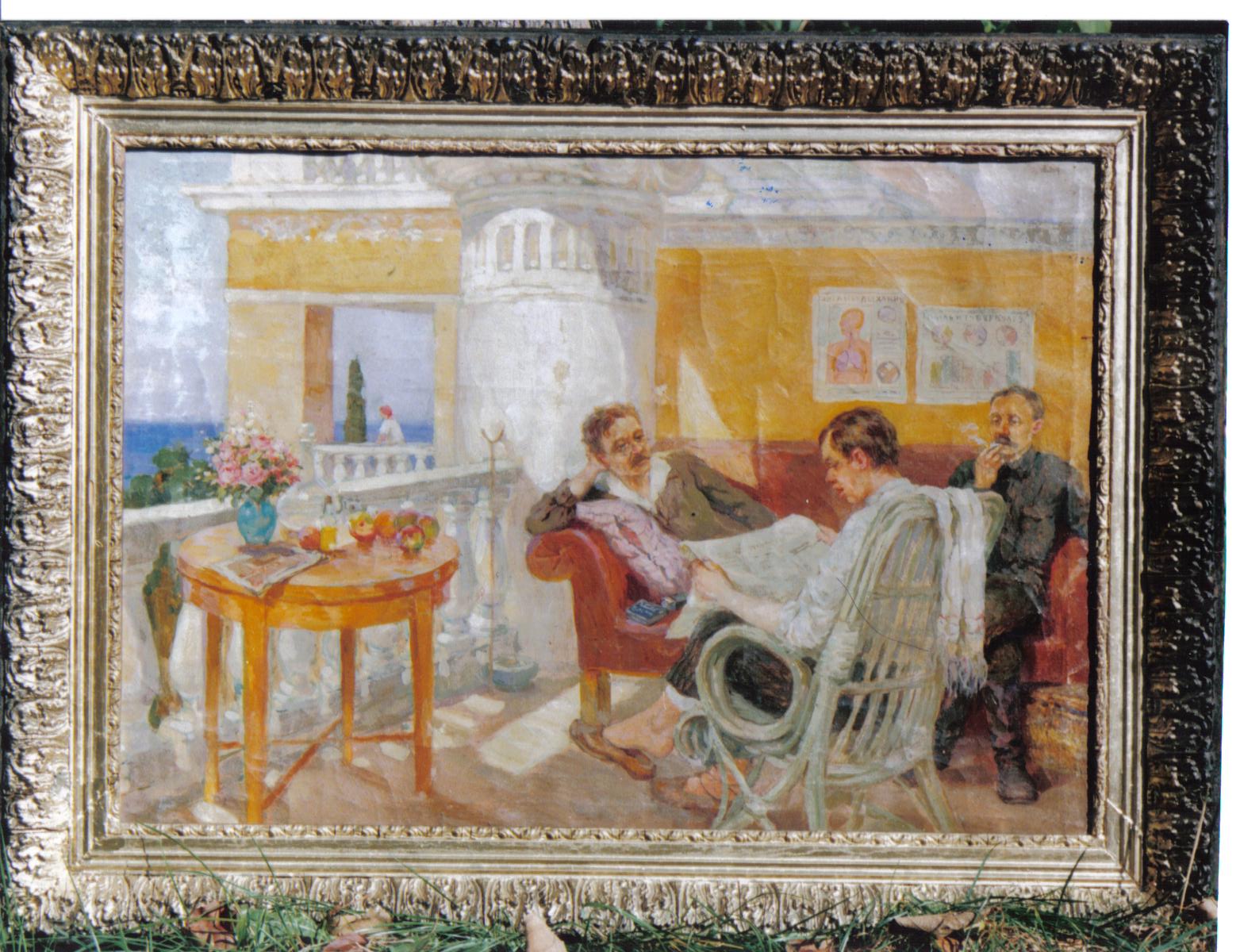 One of the most famous of his works "Working in a sanatorium, the reverse side of the picture filled, on ground almost the entire turnover of a signature and title of the picture. Oil on canvas. Size 68h48sm.