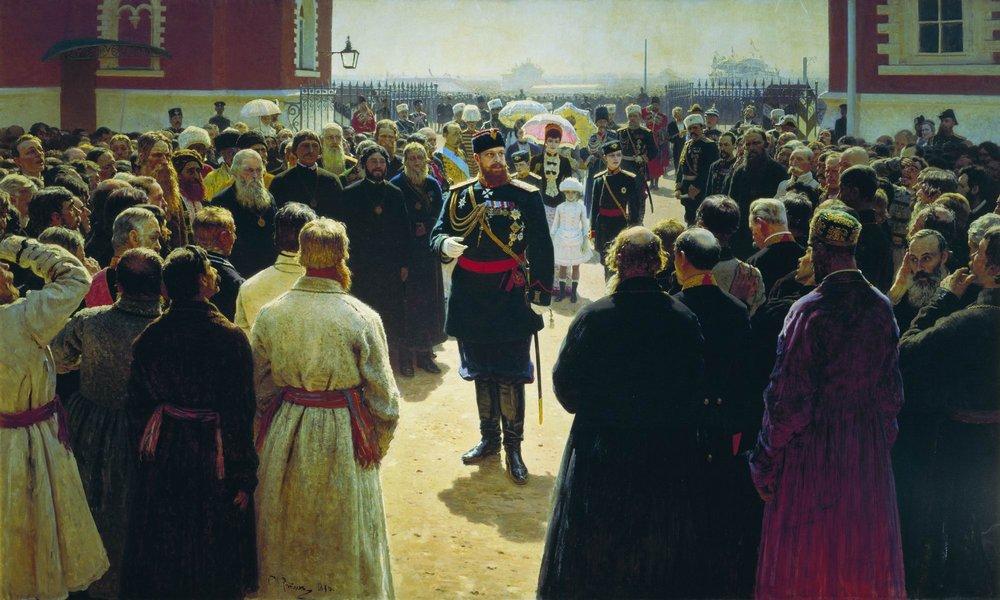 Sorry if the wrong branch of writing, but tormented by one question. In the Tretyakov I am very interested in one painting and molding. The painting depicts Tsar Alexander (if not mistaken, the Second), which delivers a speech before the township (or zemstvo) elders (or elders) in the courtyard of a palace. The exact name forgotten, the author can not remember. Tell me, please! shl Online GTG unable to find in google too |
