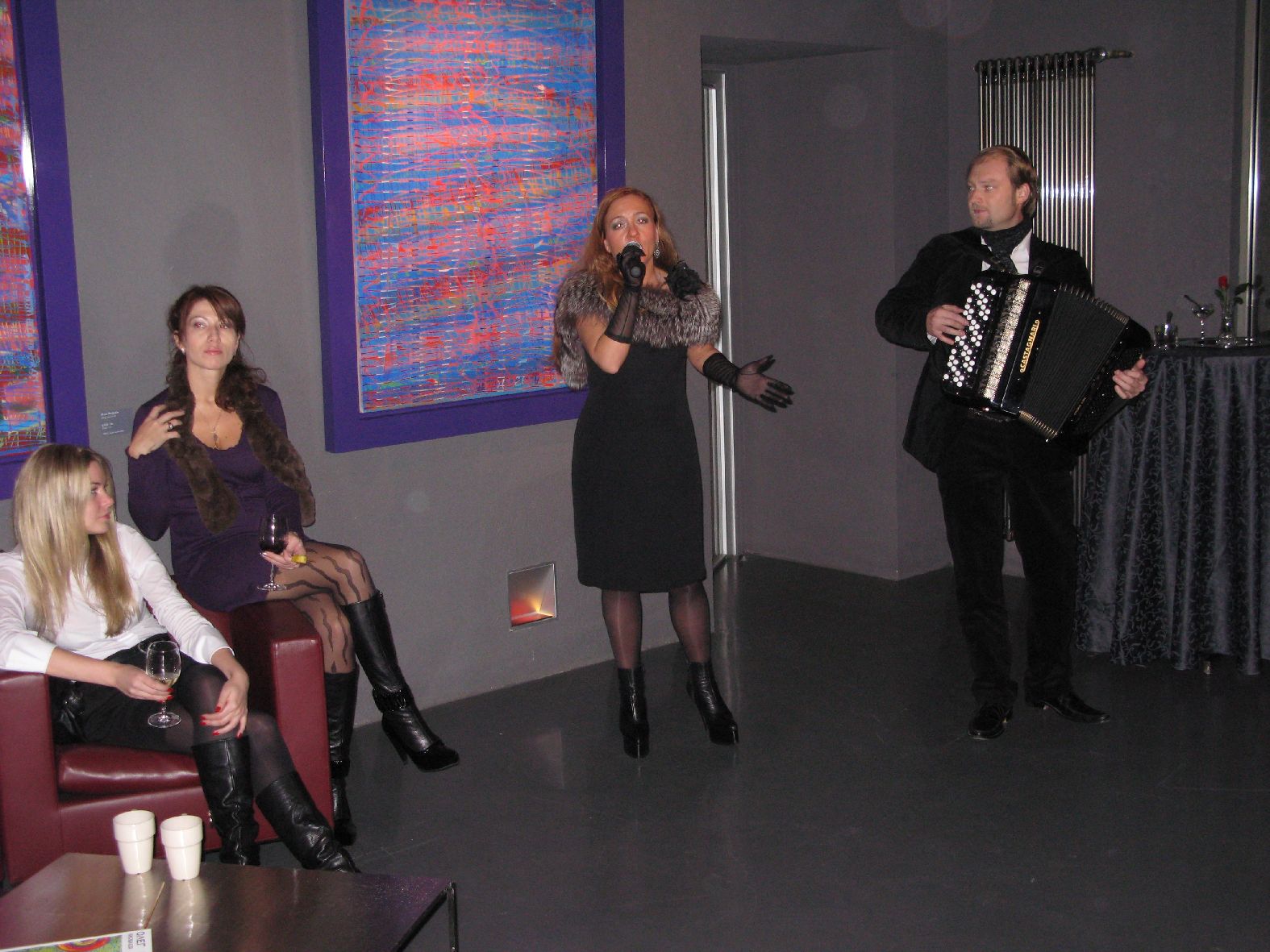 Несколько слов о мероприятии. Выставку открыл А. Боровский, сказавший прочувствованную речь о художественных и человеческих достоинствах экспонента. Экспозиция включала около 15 довольно больших по размеру холстов (хотя в каталоге, изданном к выставке - 30 работ). Все работы были оформлены в фиолетовые рамы, как ни странно, не мешавшие восприятию самой живописи. Хуже было со светом, так как освещены были только сами картины, а в целом в залах было не очень светло. Открытие сопровождалось традиционным французским шансоном в живом исполнении под аккордеон Вот пресс-релиз галереи: Олег Яковлев один из наиболее интересных художников-абстракционистов второго авангарда. После участия в знаменитой московской выставке нонконформистов 1975 года, он живет и работает в Париже, активно участвует в престижных арт-проектах. Однако в России его работы можно увидеть только сборных музейных выставках, посвященных абстракционизму. «Его искусство – это проявление совершенной свободы и тончайшего эстетизма. Олега Яковлева всегда интересовали простые формы. В его работах нет ни грамма излишней художественной шелухи. Жизненная легкость, которая присутствует в его восприятии мира, прочитывается в его произведениях. Ведь, чтобы сказать что-то очень сложное, иногда нужно посмотреть на это просто. Разноцветные, ярких локальных тонов, решетки, круги, извивающиеся параллельно друг другу линии, создают симметричные узоры, отражают полную внутреннюю свободу», - пишет о художнике арт-критик Юлия Лебедева. Его полотна сегодня украшают дома французских коллекционеров. И совсем необязательно интерьеры для картин Яковлева должны быть современными. Истоки стиля, найденного художником, возможно, имеют происхождение от практики скорописи Анри Мишо, произошедшей от автоматического письма сюрреалистов. А такая живопись уместна как в обрамлении стекла и металла хай-тека, так и антикварных предметов. Сергей Хачатуров, искусствовед, отмечает, что «живопись Олега Яковлева убеждает очень хорошим качеством. Видна школа, воспитание, точный и умный глаз. Черные круги на черном холсте изыском тональной гармонии спорят с композициями выдающегося французского абстракциониста Пьера Сулажа». «Есть тип художников, настаивающих на возможности визуализации иных реальностей, не связанных с окружающей действительностью, с наличной реальностью. Речь идёт о репрезентации внутреннего – психических процессов, матриц сознания, работы перцепции. Мне думается, Яковлев занят именно этим», – говорит Александр Боровский, заведующий отделом новейших течений Государственного Русского музея. Яковлеву удалось найти и утвердить новое развитие супрематизма: супрематисты пользовались жесткой структурой линий, а Яковлев линиями играет как струнами - на его холстах линии завихляются, дрожат, извиваются и даже напоминают помехи на экране телевизора. За черной паутинкой может быть нарисован какой-нибудь цветной клубок. Сохраняя лаконичность в форме художественного высказывания, он добивается эмоционального содержания, оперируя линиями как музыкальным ритмом. Рисуя мастерски, не обязывает зрителя испытывать чувство неловкости в поисках глубинного смысла и отрицает необходимость сверхзадачи. Неуловимая эмоциональность картин Яковлева, несмотря на то, что Вы видите всего лишь