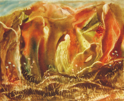 Георгий Николаевич писал в статье «Мой Дао»: «Много раз я пытался обыграть тему гигантской спирали, которая, находясь где-то за плоскостью листа, попадая на лист, закручивала в своих причудливых изгибах целые стихии, море, горы, города, миры человеческих грез и уносила бы все это в глубину листа, в бесконечность». Символикой такой «бесконечности» являлись совершенно разные вещи, олицетворяющие некое постоянство. В первой работе – угловатые волны Времени окружают святой мазар на возвышенности Чупон-Ата под Самаркандом. Во второй, «Рапсодия», - звуки музыки, раструбные звучания национальных корейских инструментов, шуршание камыша, закручиваясь волнами, сливаются воедино в лики женщины и мужчины в корейском головном уборе. В третьей – в центре оказался гигантский трилобит, навечно окаменевший в скальных отвалах морского берега Сахалина. |