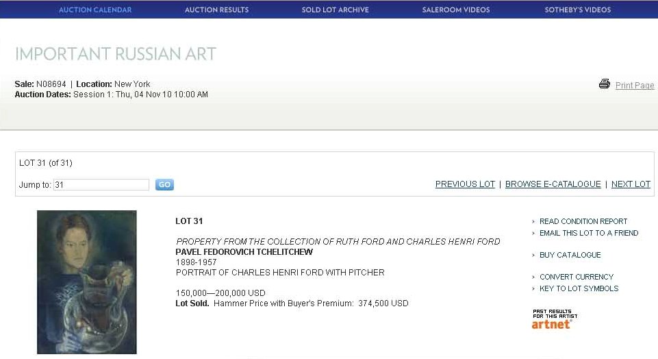 Work Chelishchev gone just to cheer. Russian painting sold at 10,586,500 USD PDI less, well, too - 2,511,564 USD * http://www.sothebys.com/app/live/lot..._number=N08718 http://www.sothebys.com/app/live/lot..._number=N08694 One can only rejoice for the people! |